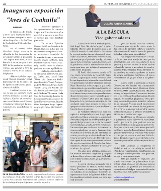 neral, “Aves de Coahuila” podrá Tobón, Elsa Zamarrón Rodrí- nal de La Laguna igual con dos vertientes: crea- representantes de grupos afines a sus gobier-