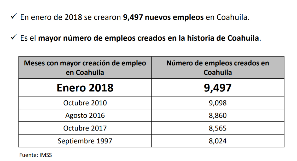 De acuerdo con cifras oficiales del IMSS, la creación de empleo durante enero de 2018 en Coahuila fue de 9,497 nuevos puestos, lo cual significa 6,182 puestos o 186.5% más que la creación reportada en enero de 2017 (3,315), y 7,205 puestos o 314.3% superior al incremento promedio de los eneros de los 10 años previos (2,292). Este es el mayor aumento reportado en un mes de enero desde que se llevan registros.