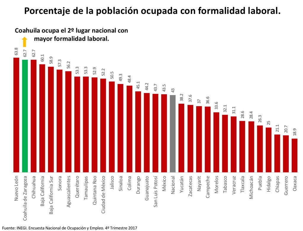 COAHUILASLIDER Coahuila, segundo estado con mayor formalidad en México Por El Heraldo de Saltillo - 13 febrero, 2018 FacebookTwitterPinterestWhatsApp Coahuila es ahora la segunda entidad con mayor formalidad en el país con el 62.7% de su población ocupada, solo por detrás de Nuevo León, esto de acuerdo con datos del INEGI. Fuente. Encuesta Nacional de Ocupación y Empleo 4 Trimestre 2017. INEGI.