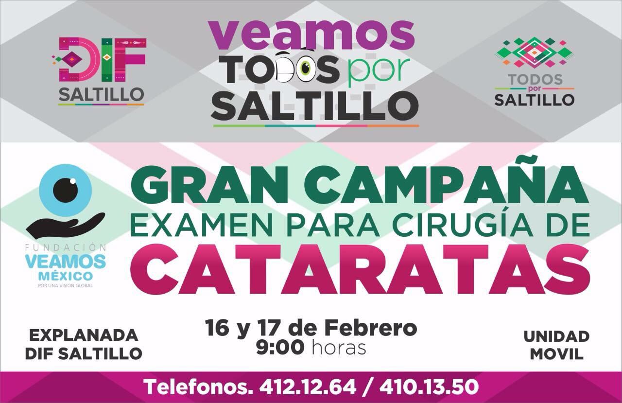 El Gobierno Municipal, a través del DIF Saltillo en coordinación con la Fundación Veamos México, arrancará el viernes 16 y sábado 17 de febrero el programa Veamos Todos por Saltillo, cuya primera fase será la realización de exámenes para detectar candidatos a cirugías de cataratas.