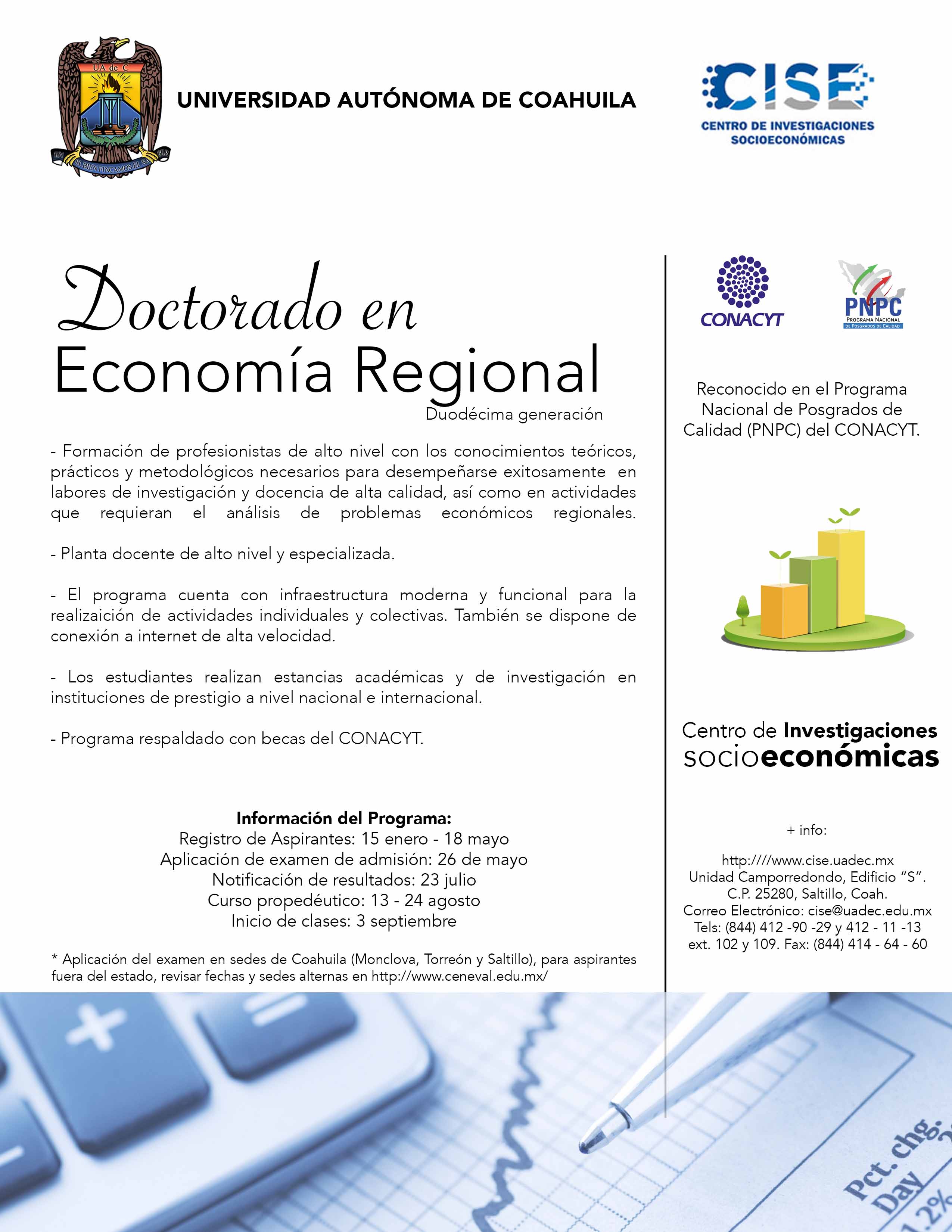 El Centro de Investigaciones Socioeconómicas (CISE) de la Universidad Autónoma de Coahuila, convoca a inscribirse al Doctorado en Economía Regional están abiertos para el periodo 2018-2022.