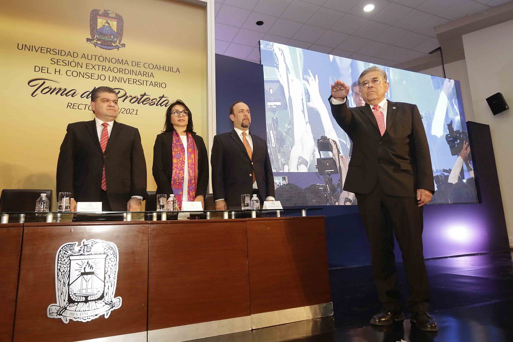 Torreón.- Ante el H. Consejo Universitario, comunidad estudiantil y docente, funcionarios y representantes de la sociedad civil y del sector gubernamental, Salvador Hernández Vélez tomó protesta como Rector de la Universidad Autónoma de Coahuila para el periodo 2018-2021.