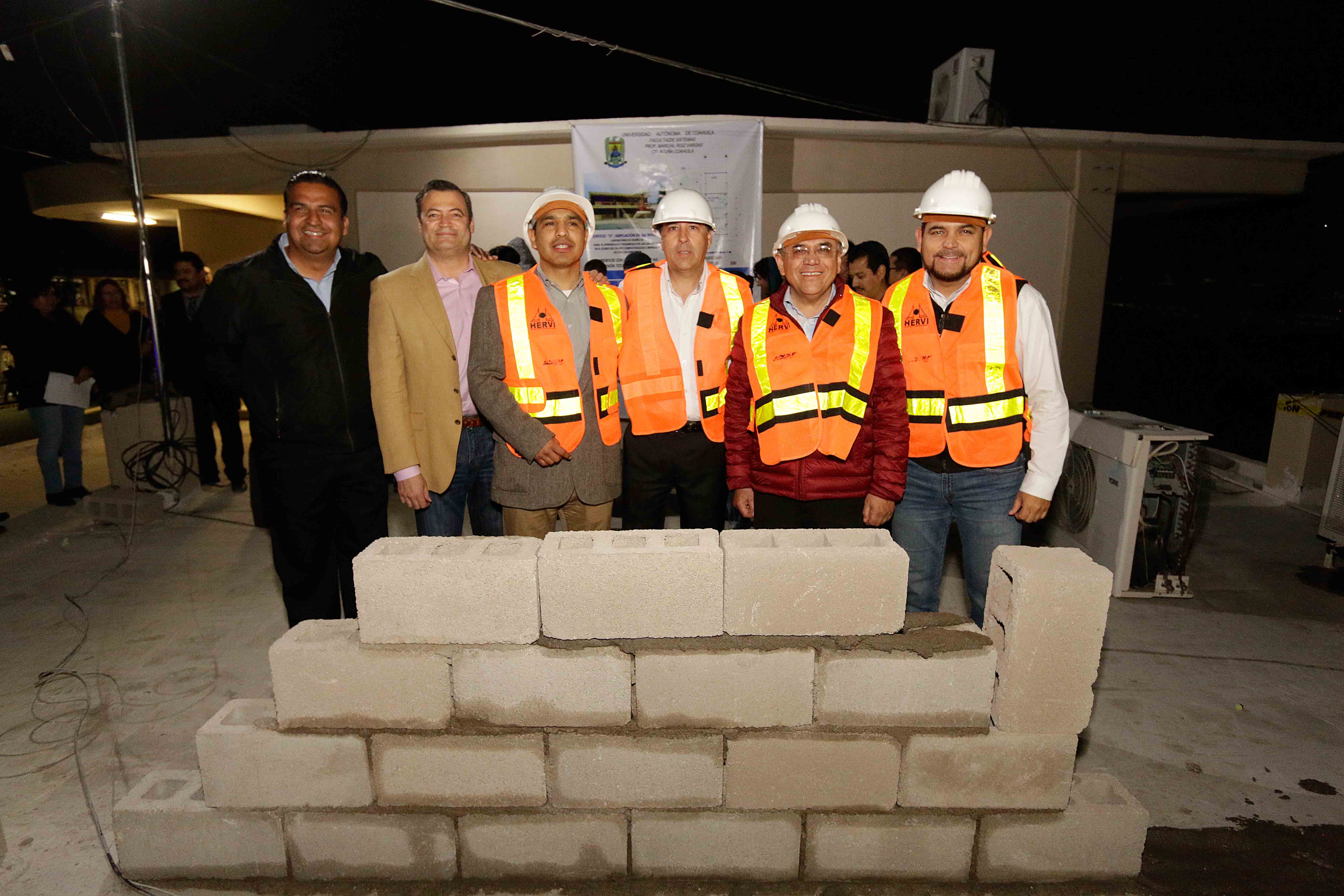 El Rector, acompañado por el coordinador de la Unidad Norte, Javier Toledo Aguilar; Jared Álvarez Almanza, representante de la Fundación ARCONIC; Carlos Obrador Garrido Cuesta, Cónsul de México en Del Río, Texas; Saúl Noguerón Contreras, director del Instituto Tecnológico Superior de Ciudad Acuña y Jesús Navarro Flores, director de la Escuela de Sistemas, puso la primera piedra del laboratorio.