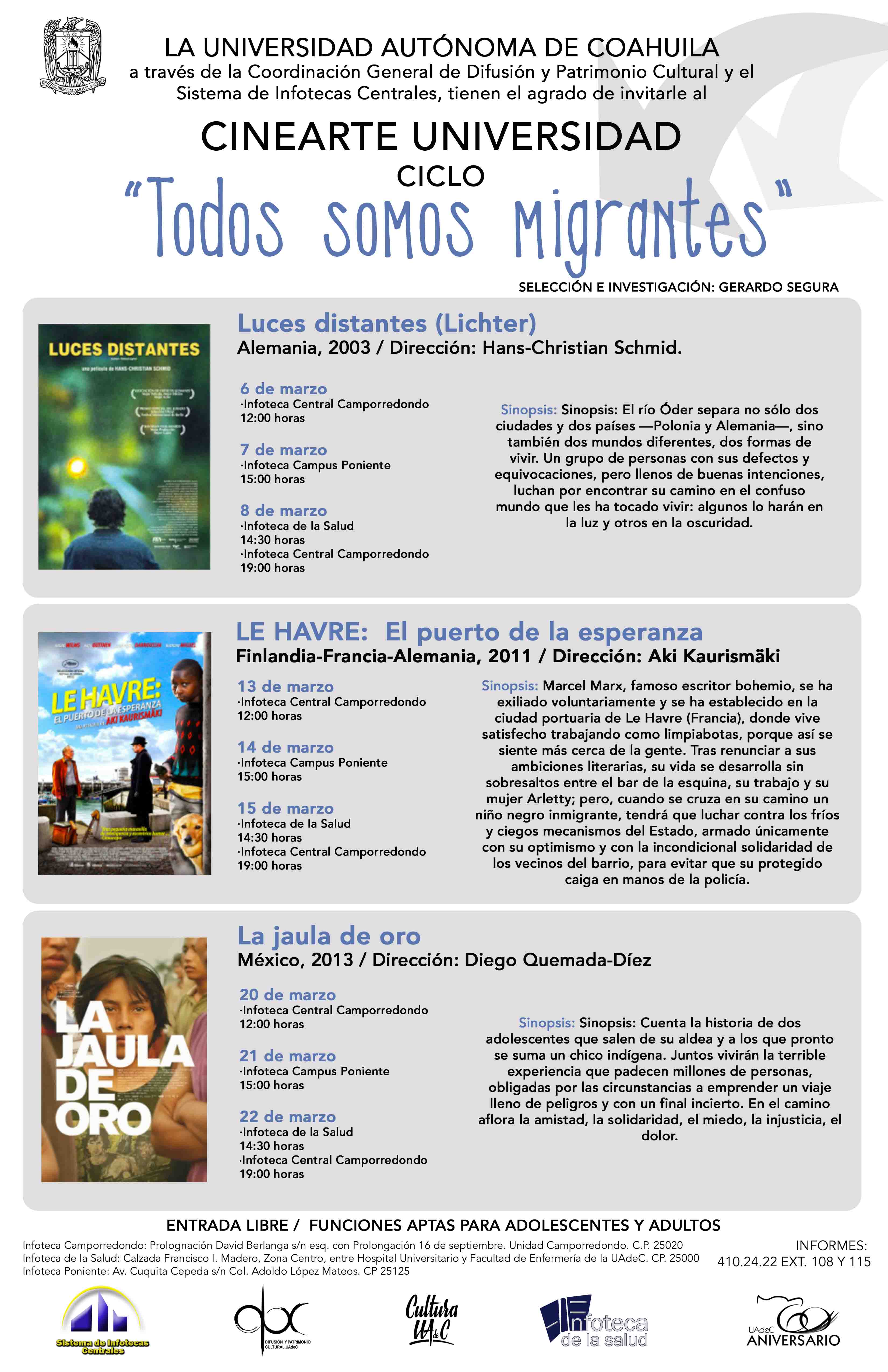 Dentro de las actividades del Segundo Ciclo de CINEARTE UNIVERSIDAD, se presentarán tres filmes con la temática “Todos somos migrantes”, en la Infoteca Central Unidad Camporredondo, Infoteca de la Salud ubicada entre las facultades de Medicina y Enfermería y la Infoteca Poniente ubicada a un costado de la Facultad de Trabajo Social.