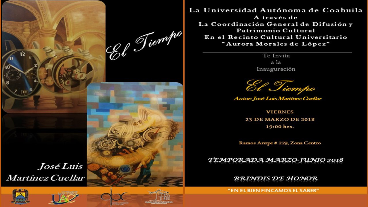 Por otro lado, el viernes 23 de marzo a las 19:00 horas se inaugura la exposición “El Tiempo”, de José Luis Martínez en el Recinto Cultural Universitario “Aurora Morales de López”, ubicado en la calle Ramos Arizpe 229, zona centro.