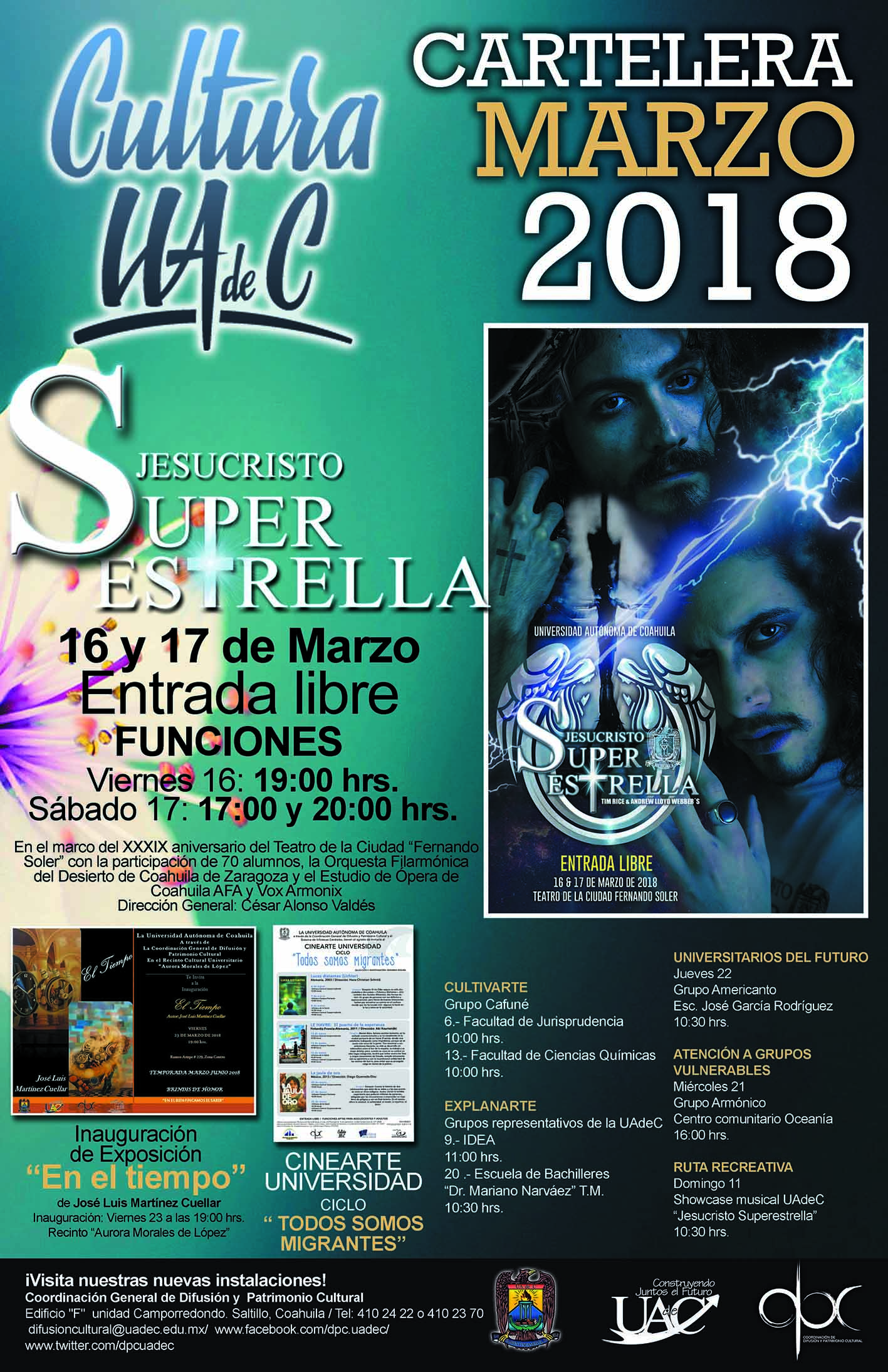 La Universidad Autónoma de Coahuila, a través de la Coordinación General de Difusión y Patrimonio Cultural, invita a la comunidad universitaria y al público en general a disfrutar de las diversas actividades culturales a realizarse durante el mes de marzo.