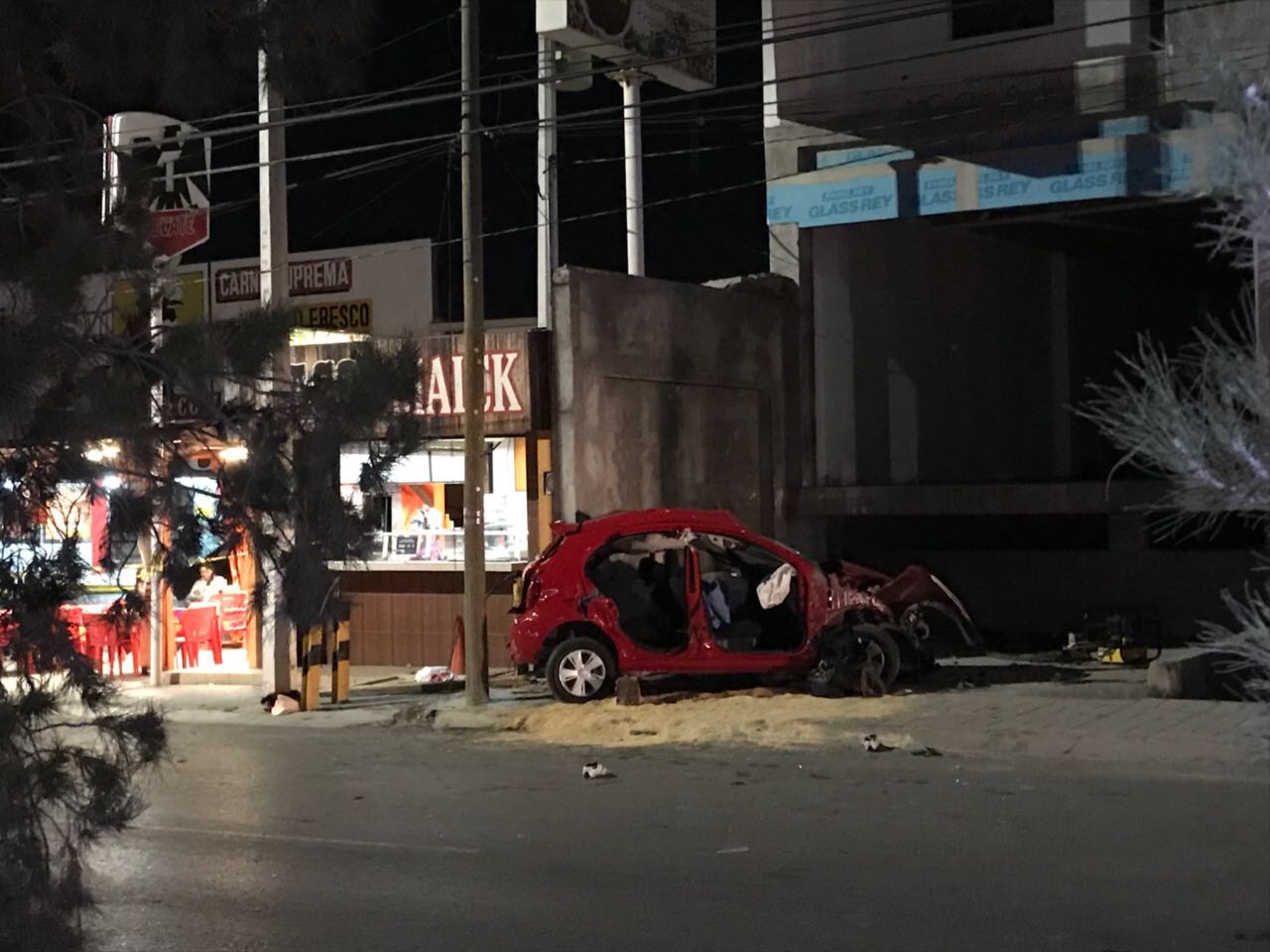 Luego de varios giros el vehículo se impactó contra un poste de concreto y debido a la velocidad giró bruscamente 90° tumbando una caseta de teléfono público para posteriormente proyectarse contra a barda de un negocio.