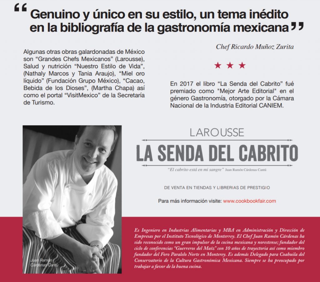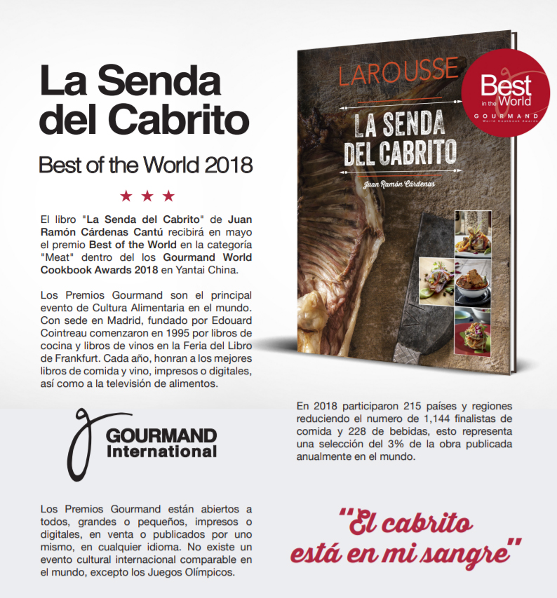 El libro «La Senda del Cabrito» del reconocido chef saltillense Juan Ramón Cárdenas Cantú, recibirá en mayo el premio Best of the World en la categoría «Meat» dentro de los Gourmand World Cookbook Awards 2018 en Yantai China. Los Premios Gourmand son el principal evento de Cultura Alimentaria en el mundo. Con sede en Madrid, fundado por Edouard Cointreau comenzaron en 1995 por libros de cocina y libros de vinos en la Feria del Libro de Frankfurt. Cada año, honran a los mejores libros de comida y vino, impresos o digitales, así como a la televisión de alimentos.