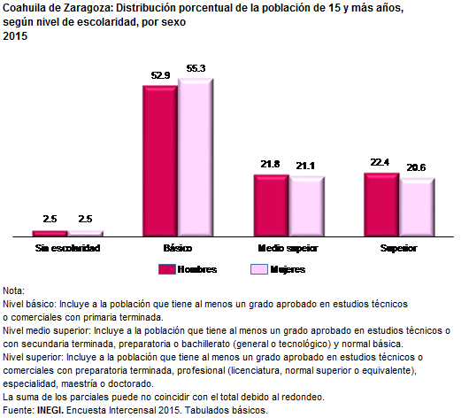 En la distribución porcentual de la población de 15 a más años y que representa el 62.3 por ciento de la población total de Coahuila las condiciones de educación son muy parejas entre hombres y mujeres, sin embargo en el nivel básico las mujeres tienen una ligera ventaja pues el 55.3 termino este nivel mientras que la población masculina sólo lo hizo el 52.9. En el nivel medio superior el 21.8 de los hombres tienen este nivel y el 21.1 corresponde a las mujeres. En el nivel superior la población masculina tiene una ligera ventaja pues el 22.4 de los hombres termina este nivel educativo tanto que las mujeres solo lo finaliza el 20.6 por ciento.