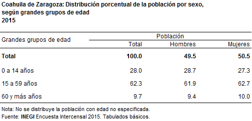 La población de Torreón, tiene una relación de 94.4 hombres por cada 100 mujeres, San Juan de Sabinas de 94.7 y Monclova, con una relación de 96.9. Mientras que Frontera (99.9); Cuatro Ciénegas y Sabinas (100.6%) es donde la presencia de hombres y mujeres es casi la misma.
