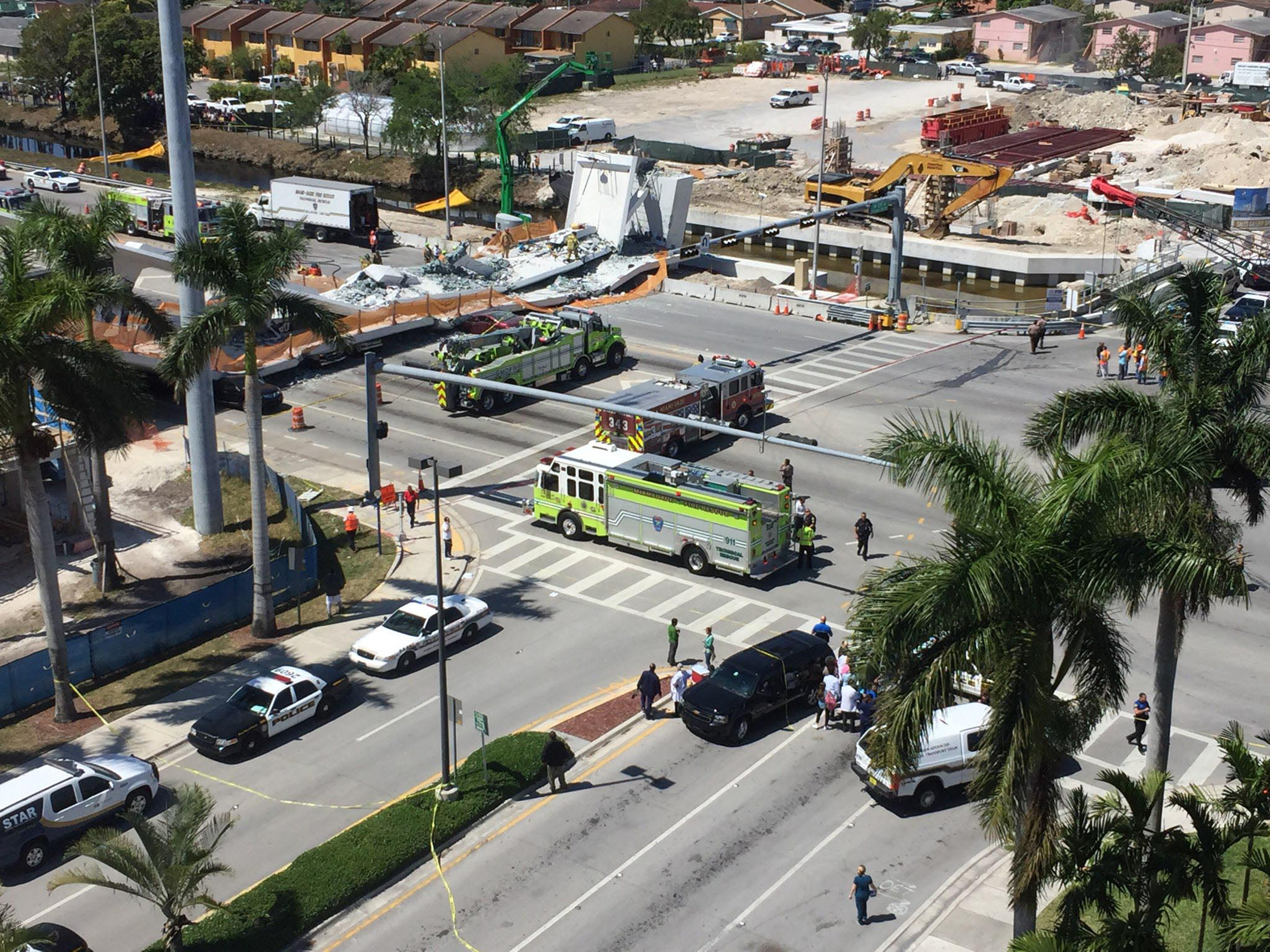 Los bomberos de Miami-Dade, detectives de homicidios, ingenieros y empleados federales trabajaron en la escena desde el jueves por la tarde, cuando un puente peatonal colapsó.