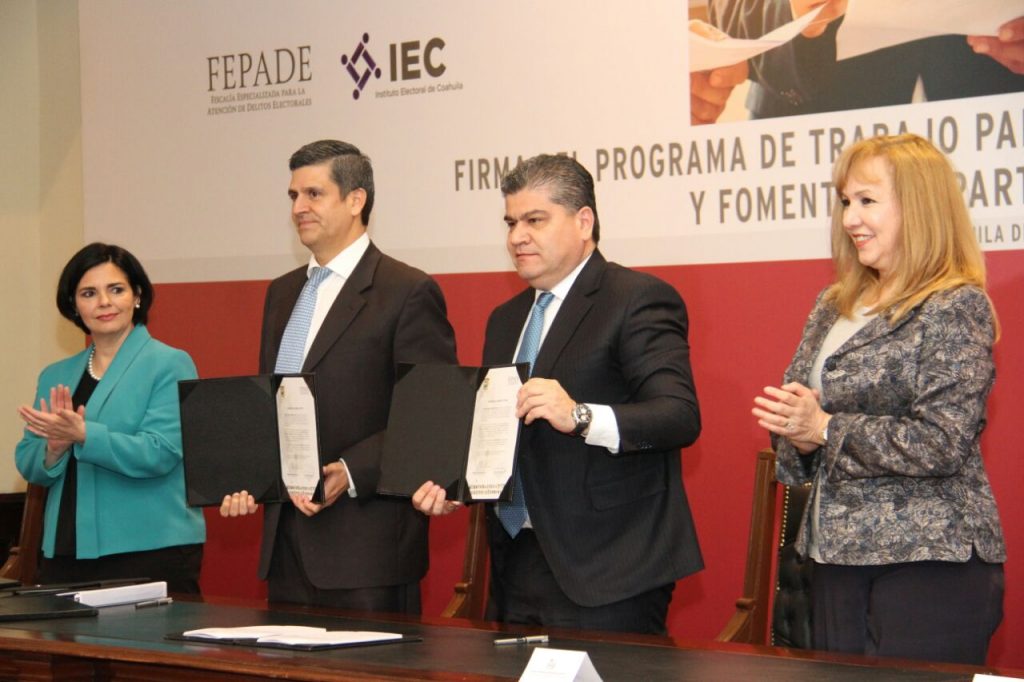 El Mandatario coahuilense firmó un plan de trabajo con la Fiscalía Especializada para la Atención de los Delitos Electorales (FEPADE) con la finalidad de blindar las elecciones, desarrollar los mecanismos de colaboración y coordinación para el fortalecimiento del combate y prevención de los delitos electorales.