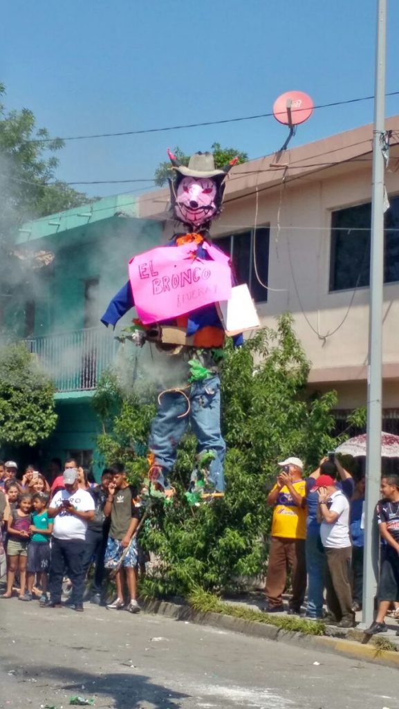 Vestido con un pantalón de mezclilla, camisa azul, cara de rata y sombrero, así como una leyenda que decía “El Bronco, ¡Fuera!” la figura que representó a Rodríguez Calderón tronó ante el júbilo de la concurrencia.