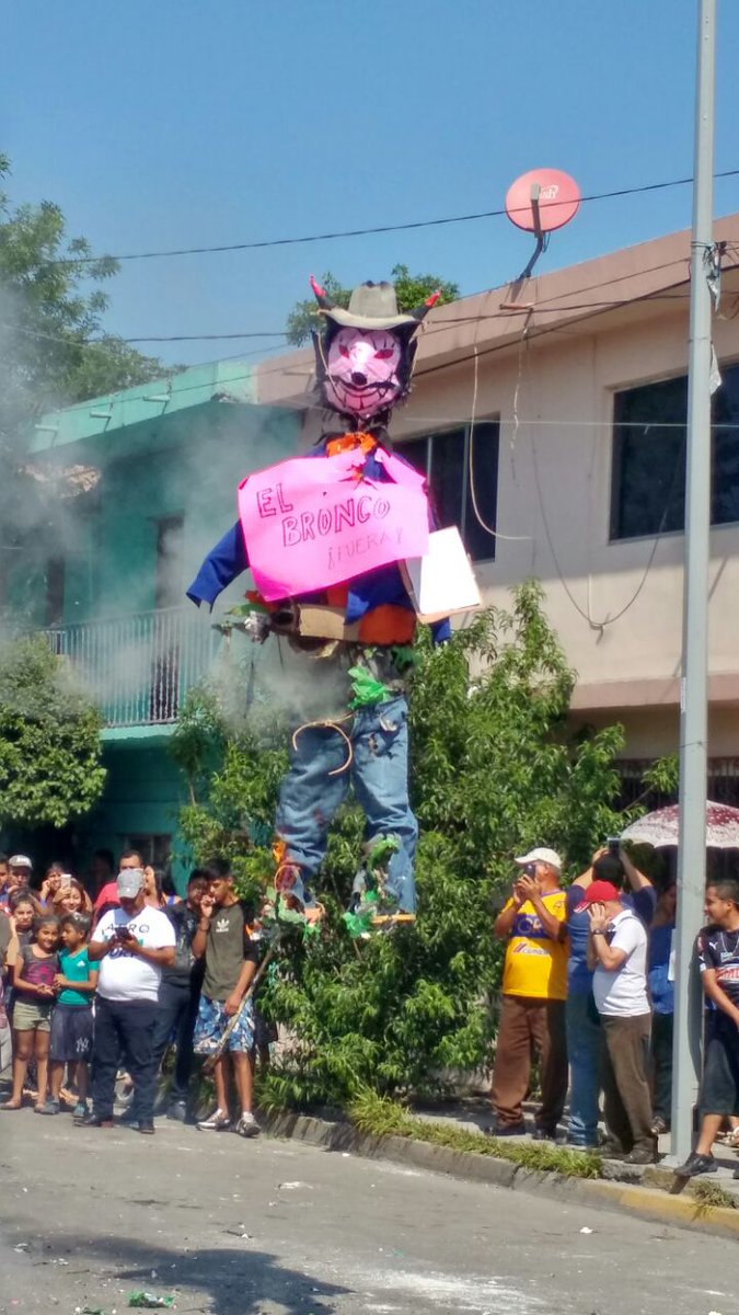 Vestido con un pantalón de mezclilla, camisa azul, cara de rata y sombrero, así como una leyenda que decía “El Bronco, ¡Fuera!” la figura que representó a Rodríguez Calderón tronó ante el júbilo de la concurrencia.