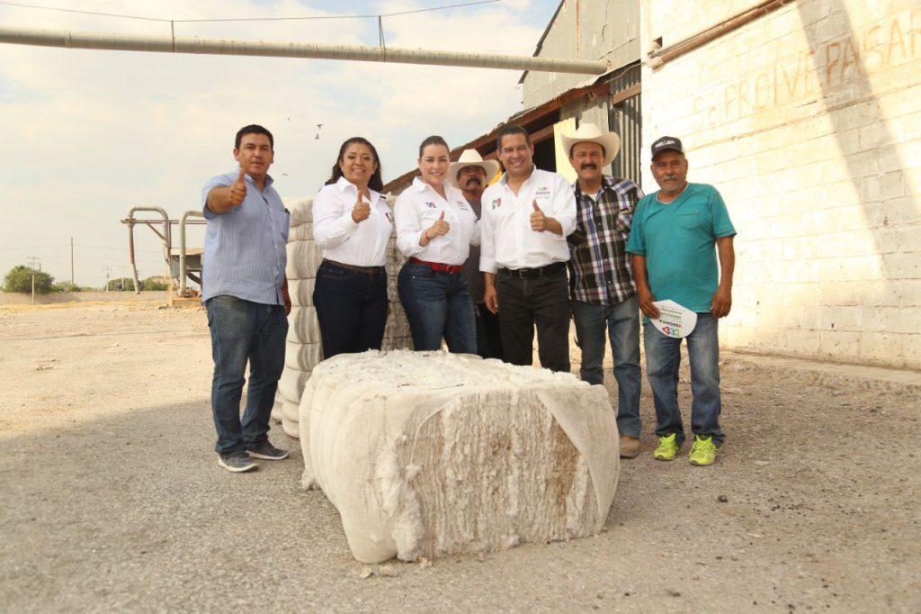 Acompañada por los candidatos a diputado federal, Richy Aguirre y a la alcaldía, Ana Isabel Durán, se reunió con los productores en una despepitadora de algodón, y con los comerciantes en la sede de la CANACO San Pedro.