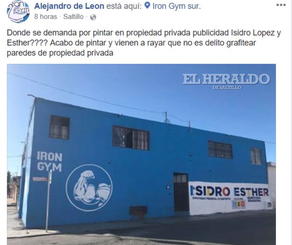 Por medio de su cuenta de Facebook, Alejandro de León, señaló que fue el pasado domingo –día en el que no laboran- cuando pintaron la propaganda, en el gimnasio ubicado en Zarco 2004, de la colonia Centenario.