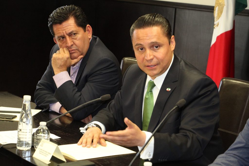 El diputado Samuel Rodríguez Martínez, Presidente de la Junta de Gobierno y el diputado del PAN Juan Carlos Guerra, Presidente de la Comisión de Seguridad Pública, acompañaron al Secretario de Seguridad Pública ante los demás diputados que asistieron a la reunión. (EL HERALDO)