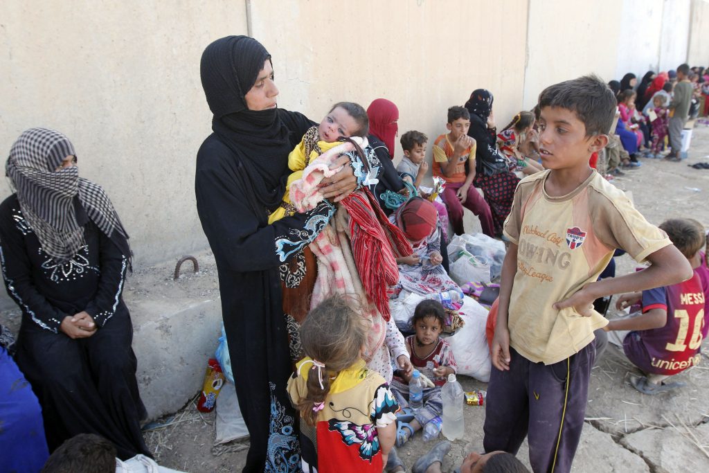 (160821) — KIRKUK, agosto 21, 2016 (Xinhua) — Personas desplazadas se reúnen en la oficina del cruce de Khaled, a 25 kilómetros al suroeste de Kirkuk, Irak, el 21 de agosto de 2016. Familias del distrito de Hawija, a 90 kilómetros de Kirkuk, se reunieron en la oficina de Khaled, para poder huir de los militantes del Estado Islámico (EI). (Xinhua/Ako Zangana) (rtg) (fnc)