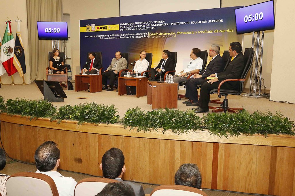 TORREÓN, Coahuila.- La Universidad Autónoma de Coahuila, la Asociación Nacional de Universidades e Institutos de Educación Superior y el Instituto Nacional Electoral, llevaron a cabo el Foro para la Presentación y Análisis de las Plataformas Electorales de los Candidatos a la Presidencia de la República “Estado de Derecho, Democracia y Rendición de Cuentas”.