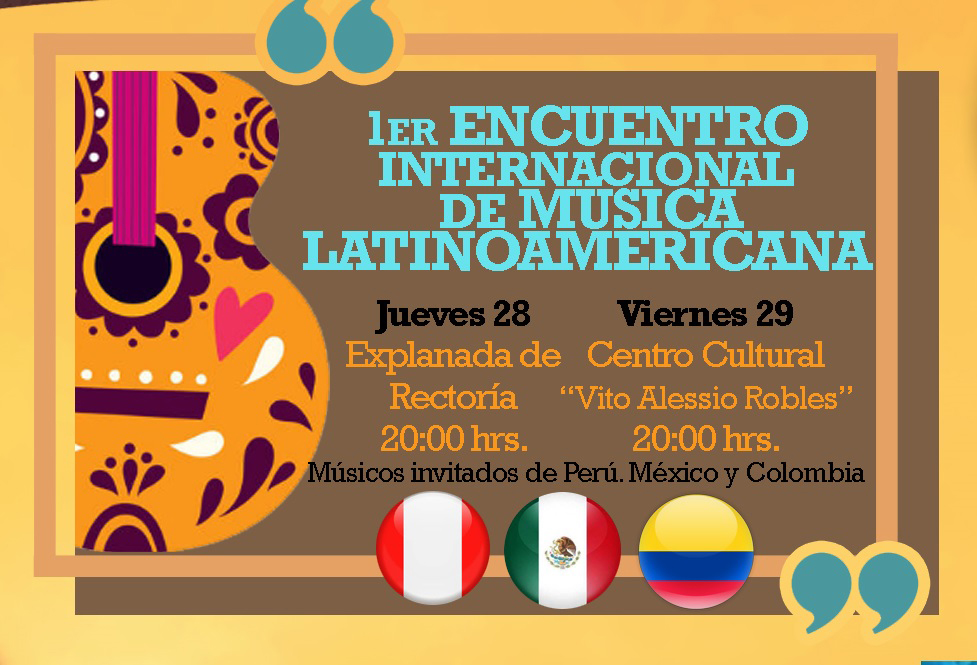 El primer encuentro internacional de música latinoamericana se llevará a cabo con la participación de agrupaciones musicales de Perú, Colombia y México; jueves 28 en la explanada de rectoría, viernes 29 en el Centro Cultural “Vito Alessio Robles” ambos a las 20:00 horas y entrada libre.