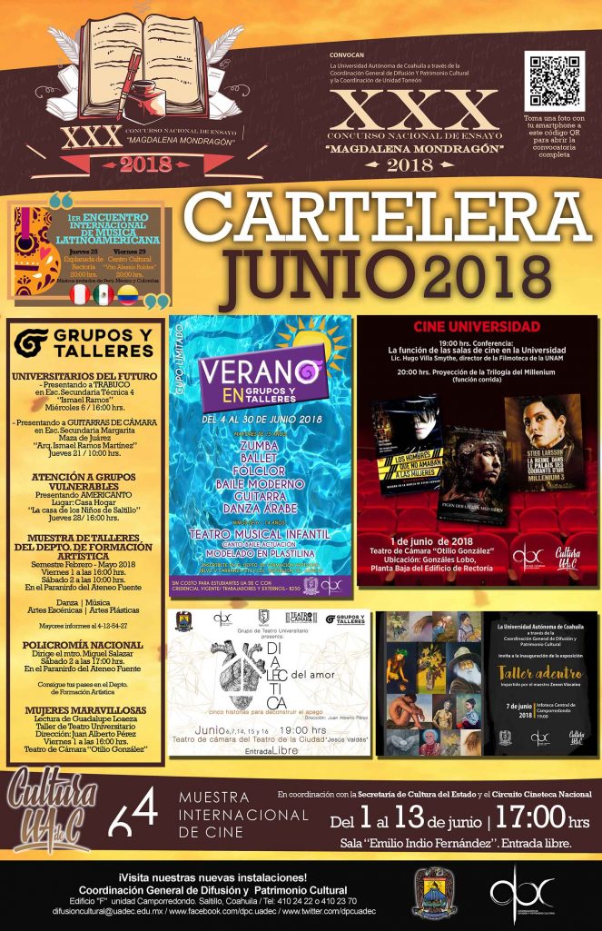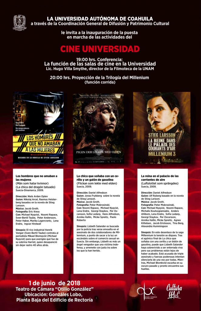 La Coordinación General de Difusión y Patrimonio Cultural ofrece en su propuesta cultural para junio 2018: Los ciclos de Cine Universidad, en un esfuerzo por volver a dar vida a la tradición de las proyecciones de películas de festivales internacionales y películas de culto, el 1 de junio a las 19:00 horas en el Teatro de Cámara “Otilio Glz.” ubicado en la parte baja del edificio de rectoría, inicia con la conferencia “La función de las salas de cine en las universidades” a cargo del Lic. Hugo Villa director de la filmoteca de la UNAM, posteriormente se proyectará en serie la trilogía Millenium.