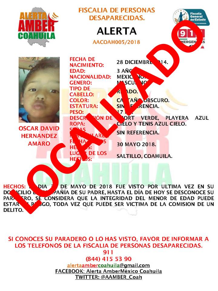 Por lo anterior y tomando en consideración que el menor se encontraba en riesgo de sufrir un daño en su integridad, la Fiscalía de Personas Desaparecidas y el equipo de ALERTA AMBER COAHUILA, en coordinación con las autoridades municipales, estatales, federales, el Instituto Nacional de Migración, así como con personal de United States Custom Border and Protection y la unidad de la Patrulla Fronteriza, se logró el aseguramiento del menor y la detención de su padre que trataba de ingresarlo a territorio estadounidense de manera ilegal.