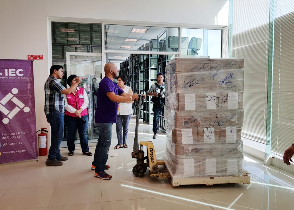 El material fue descargado y resguardado en las oficinas centrales del Instituto Electoral de Coahuila (IEC), en donde permanecerán hasta su distribución a los comités municipales.