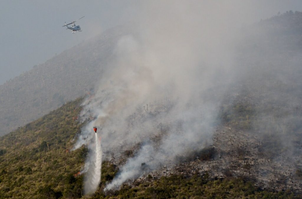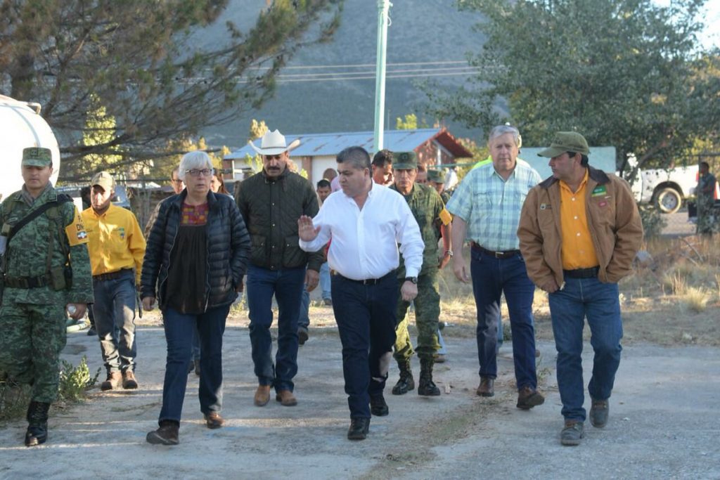 Continúan las acciones para abatir el incendio forestal de la Sierra de Arteaga con las descargas de agua con retardante, así como el trabajo de tres brigadas terrestres para el rescoldeo en las áreas siniestradas, labores supervisadas por el gobernador Miguel Ángel Riquelme Solís.