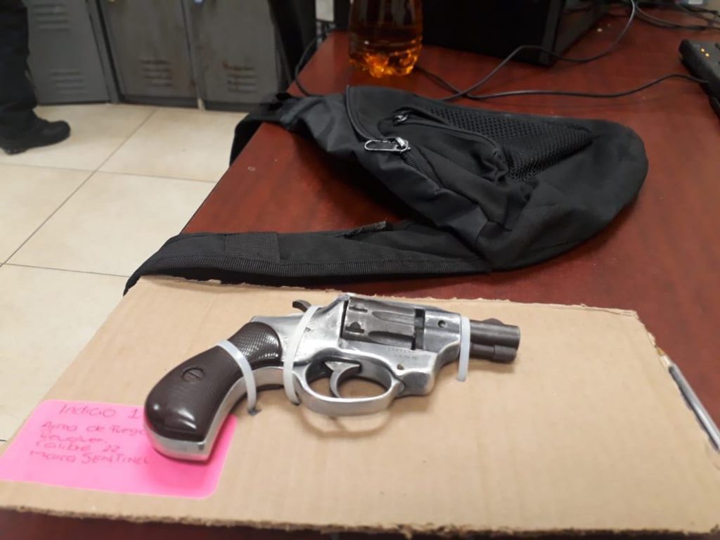 Durante la persecución aventó una mochila tipo mariconera en la que había un arma de fuego tipo revolver calibre .22 color gris, con cacha color cafe de plástico.