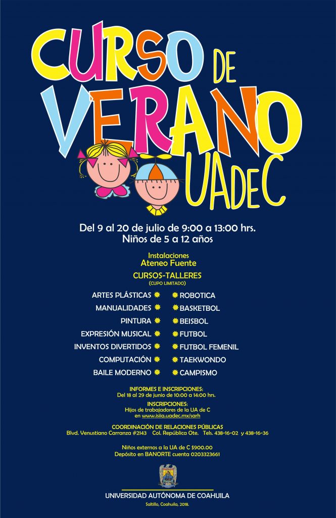 La Universidad Autónoma de Coahuila, atendiendo el compromiso que tiene con la sociedad y con el fin de promover la realización de actividades culturales, deportivas y de conocimientos, invitan a participar en la edición 2018 del Curso de Verano para Niños.