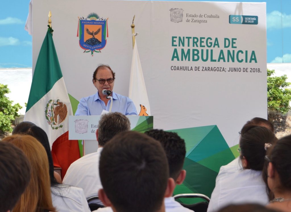 Piedras Negras, Coah.- En el Hospital General “Doctor Salvador Chavarría Sánchez” de Piedras Negras, el Secretario de Salud, Roberto Bernal Gómez, entregó una ambulancia para el traslado de pacientes que reciben atención en este centro hospitalario, y que en conjunto con las unidades entregadas esta semana en diversos municipios contempla una inversión total de 16.5 millones de pesos.