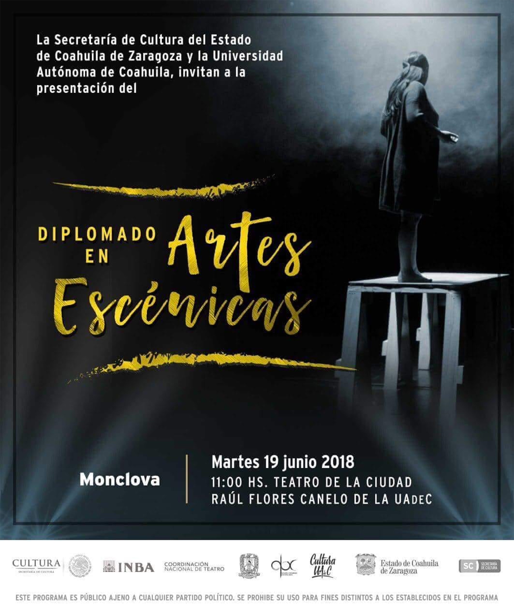 Monclova, Coahuila.- Con el fin de apoyar a la formación integral de la comunidad teatral de la región centro del estado, y para que cuenten con las herramientas necesarias para una práctica profesional de calidad en el ámbito de su competencia escénica, la Universidad Autónoma de Coahuila y la Secretaría de Cultura del Estado, invitan a participar en el Diplomado en Artes Escénicas.