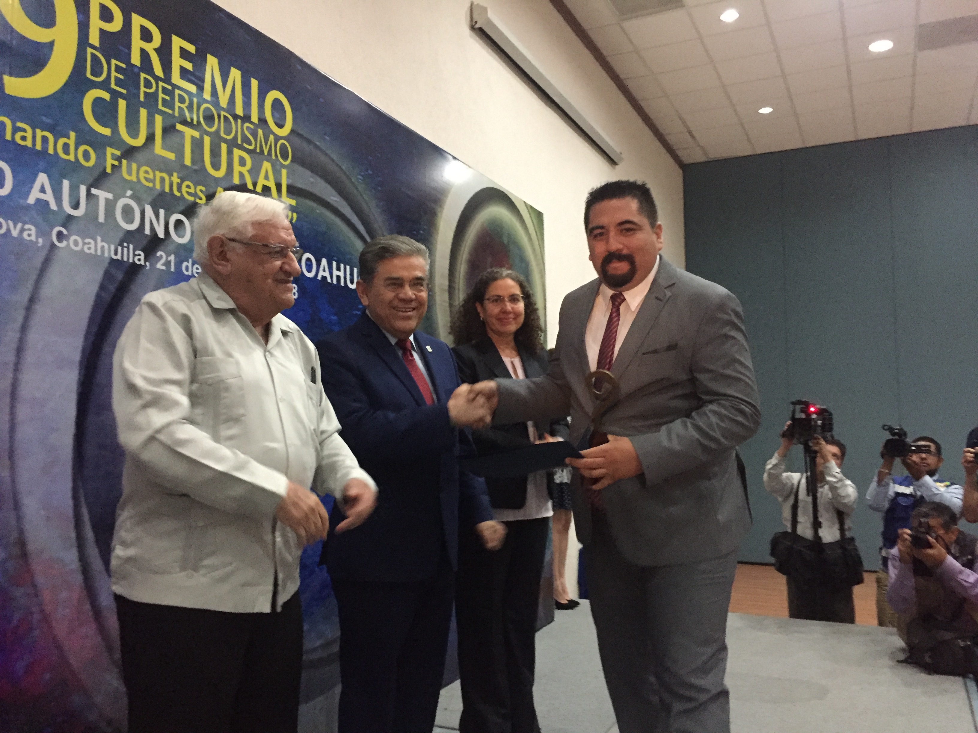 Alberto Boardman y José Torres Anguiano, colaboradores de El Heraldo de Saltillo, fueron galardonados este jueves con el Premio Estatal de Periodismo Cultural que por décima novena ocasión entrega la Universidad Autónoma de Coahuila.