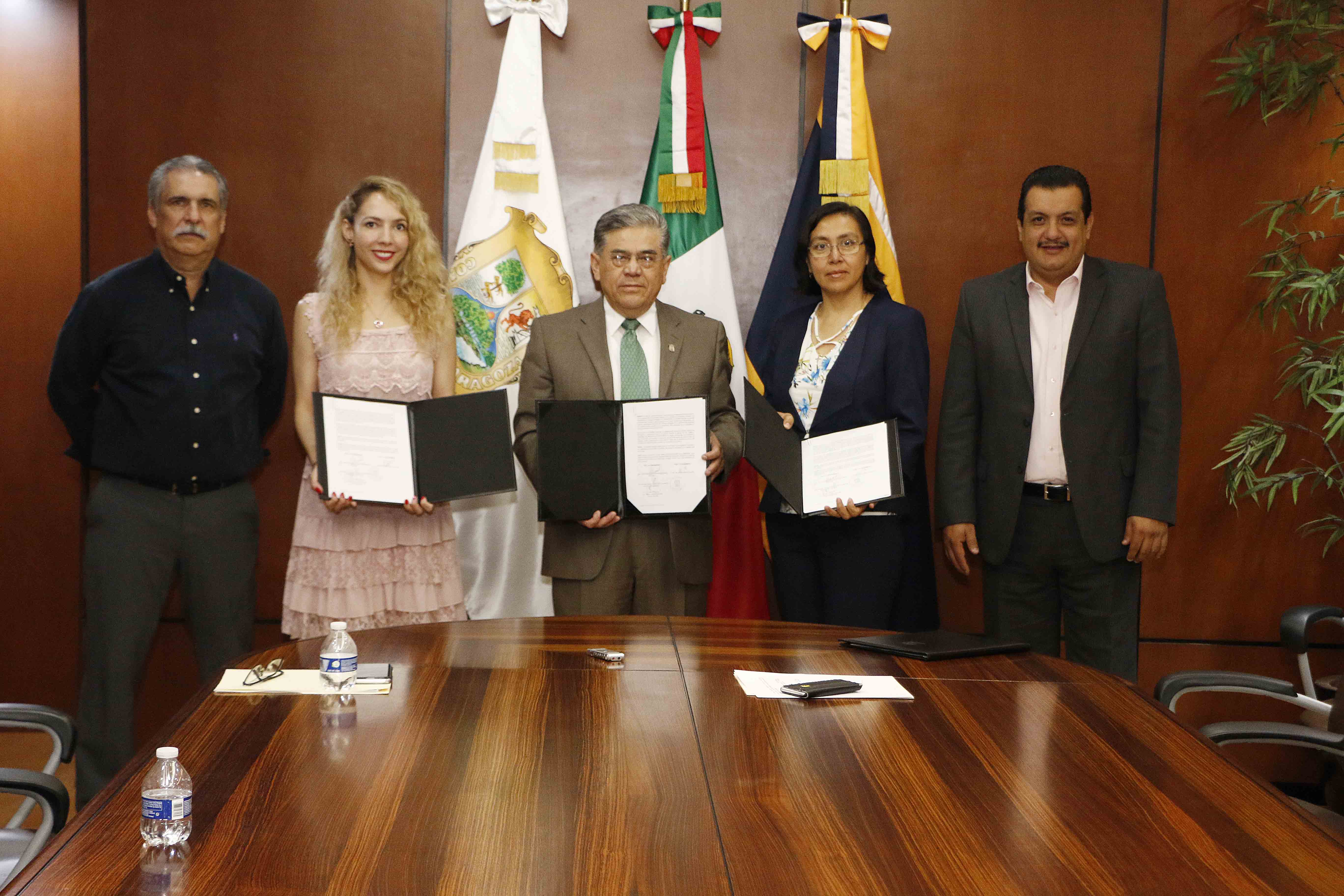 El rector, Salvador Hernández Vélez, el secretario general, Miguel Ángel Rodríguez Calderón, el oficial mayor Daniel Garza Treviño, así como las beneficiarias firmaron este acuerdo académico.