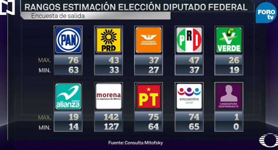 Por su parte, según la encuesta de salida, el PRI tendría de 37 a 47 diputados federales, el PRD de 33 a 43, Movimiento Ciudadano de 27 a 37, y el Partido Verde de 19 a 26, Nueva Alianza de 14 a 19.