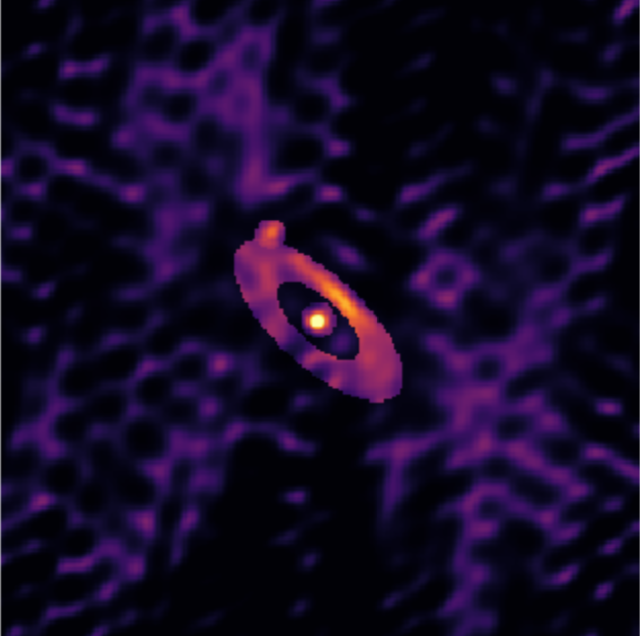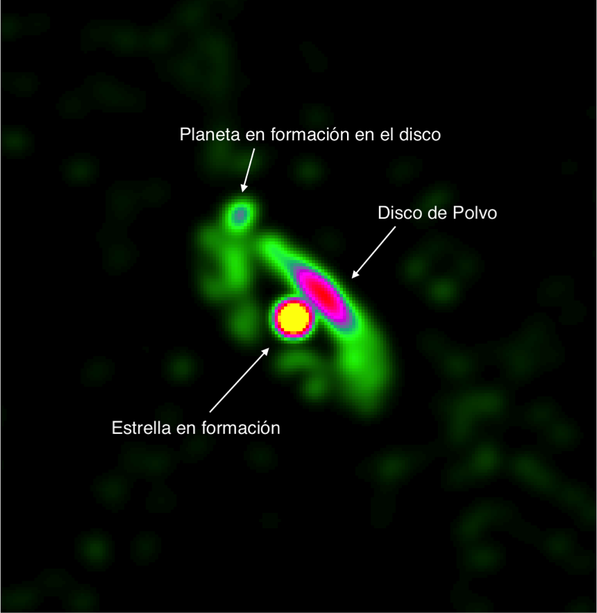 La imagen ganadora recrea una estrella central con un disco de polvo elongado y un brillo asimétrico, con un planeta en formación. Este tipo de estrellas jóvenes es común en el universo y se piensa que nuestro Sol y sistema solar tuvo un proceso de formación similar.