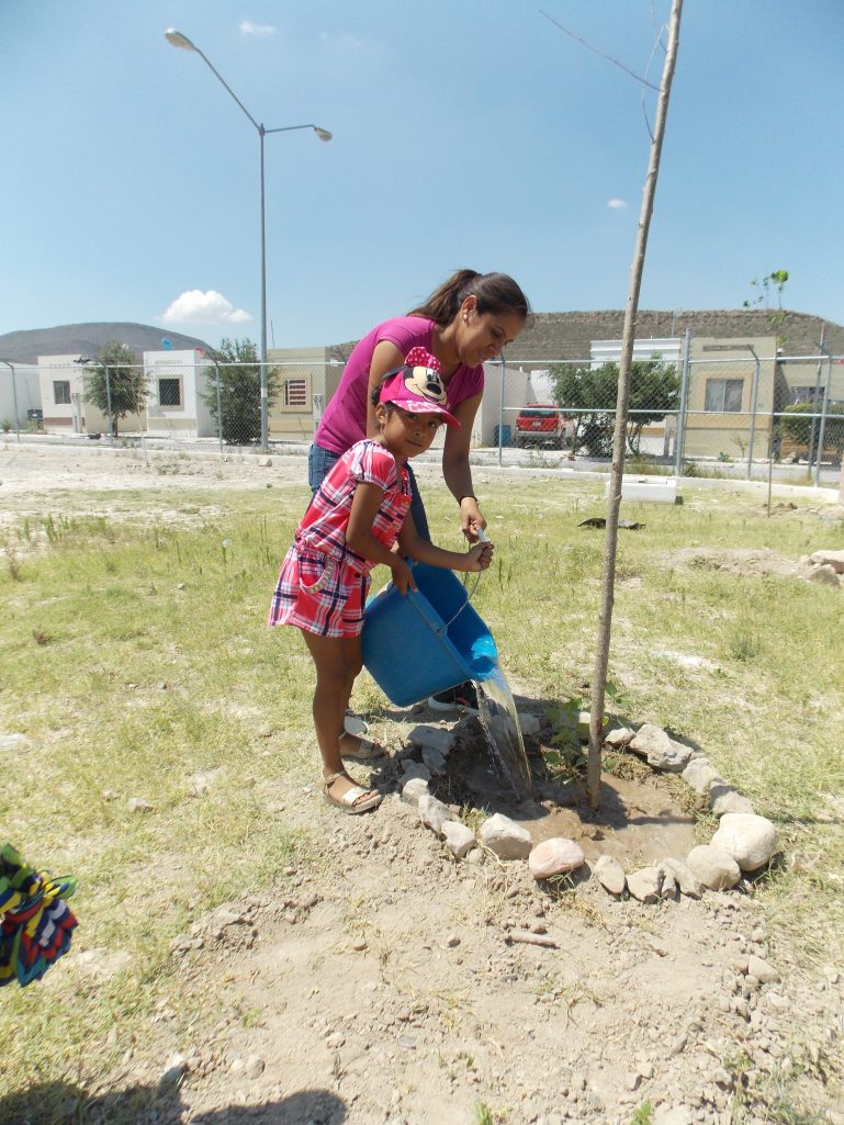 Personal de la Dirección del Medio Ambiente de Saltillo llevó hasta el jardín de niños dos docenas de árboles jóvenes para ser plantados. Con antelación, maestros, padres de familia y alumnos colaboraron con la excavación de los cepellones y la preparación del terreno.