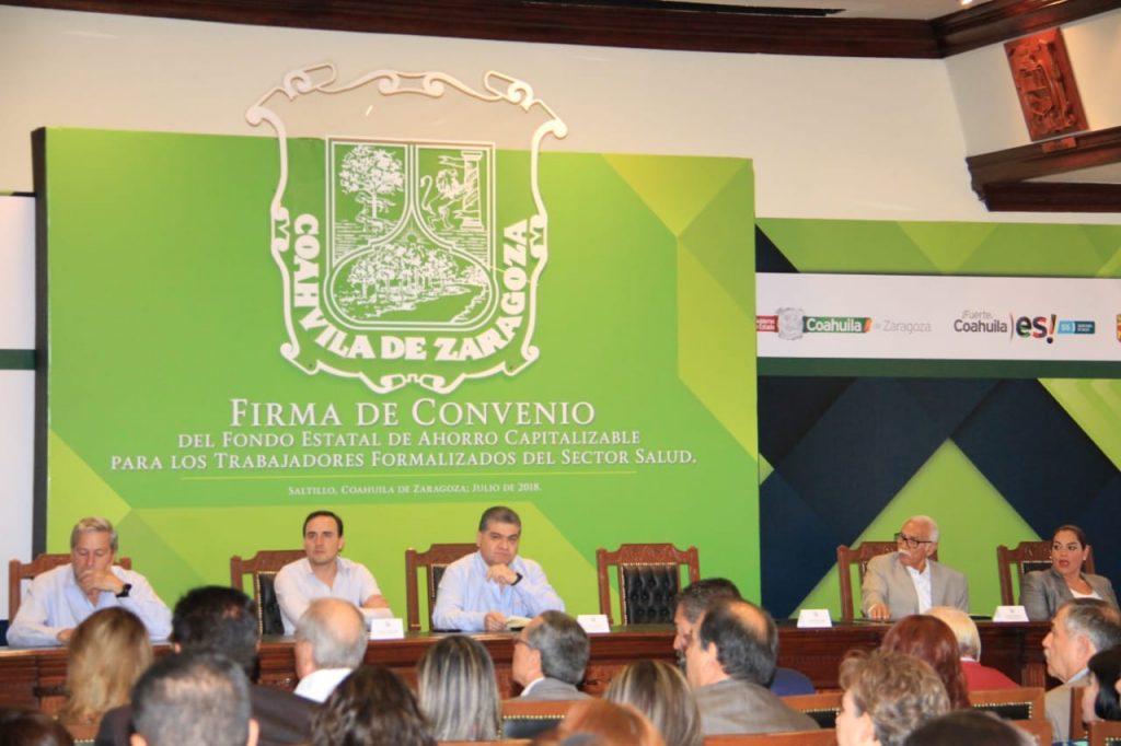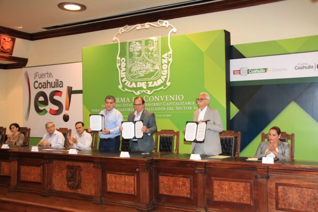 El gobernador Miguel Ángel Riquelme Solís firmó este martes el Convenio del Fondo Estatal del Ahorro Capitalizable para los trabajadores formalizados del Sector Salud, con el que se beneficiarán mil 884 trabajadores de las secciones 86 y 87 del Sindicato Nacional de Trabajadores de Salud en el estado.