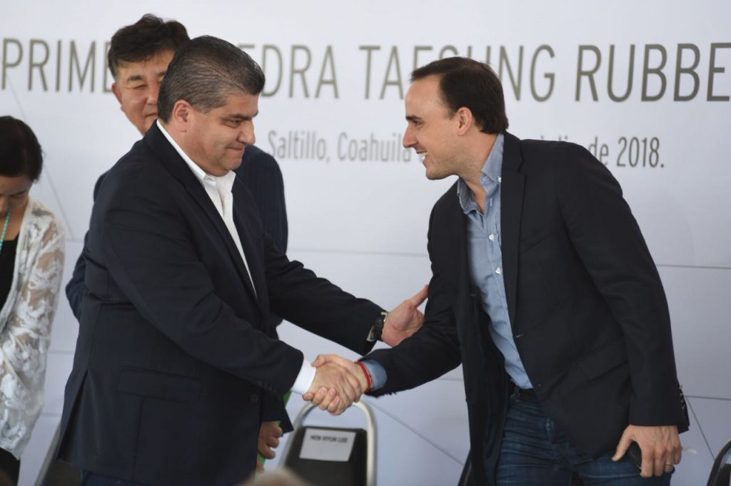 Durante la colocación de la primera piedra de la planta Taesung Rubber de México, en la ciudad de Saltillo, el alcalde Manolo Jiménez Salinas, señaló que, gracias a las gestiones y el trabajo del Gobernador Miguel Ángel Riquelme Solís, la ciudad sigue consolidándose como una potencia nacional y se generan más empleos para la región.