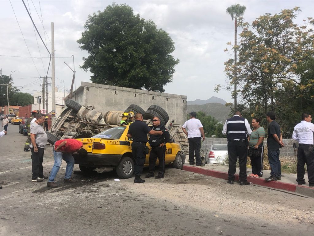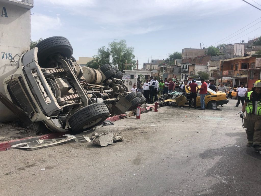 Cuatro personas resultaron lesionadas luego de que el operador de un camión revolvedora chocara y volcara sobre la calzada Antonio Narro, a escasos metros de la clínica Uno del IMSS.