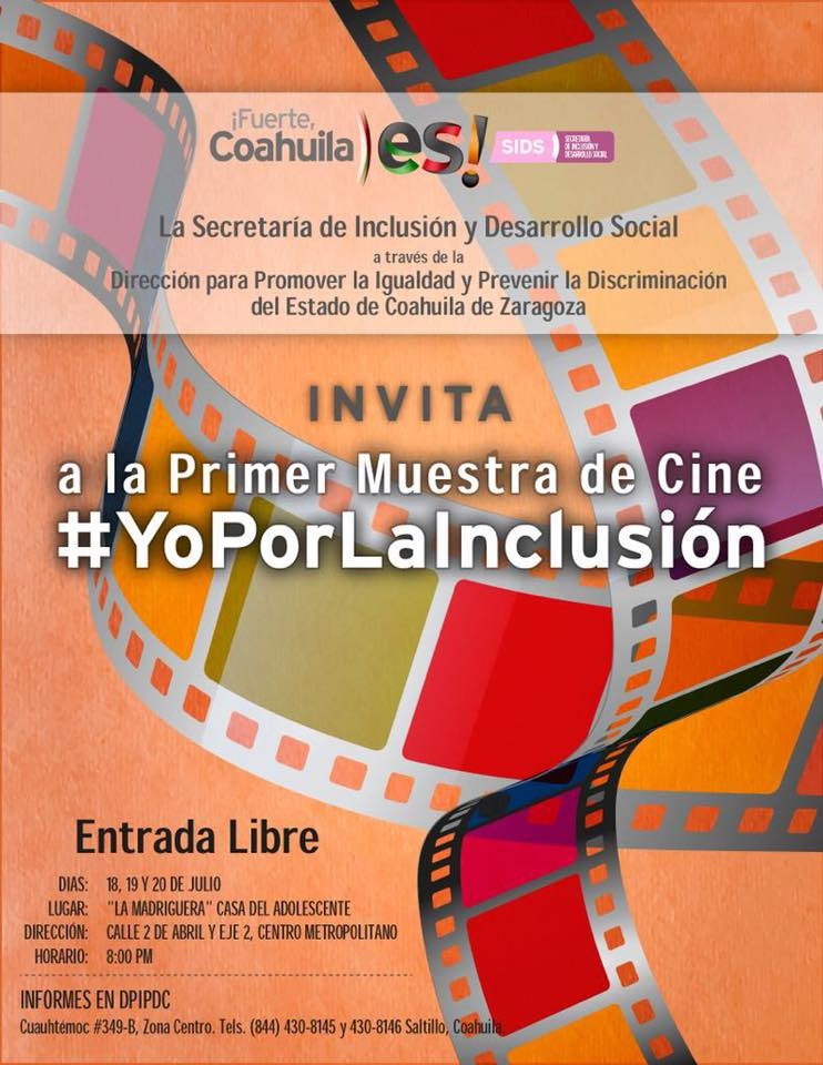 Coahuila tendrá la primera muestra de cine “Yo por la Inclusión”, los días 18, 19 y 20 de julio en las instalaciones de “La Madriguera” Casa del Adolescente, en Saltillo.