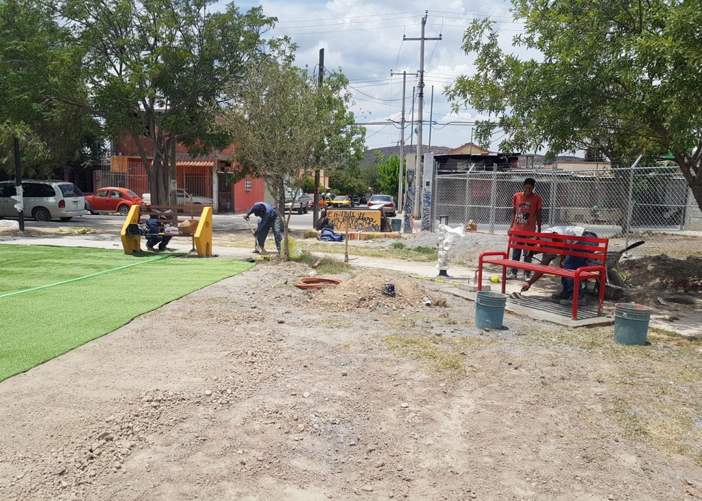 La rehabilitación de este espacio público incluye la instalación de pasto sintético, sobre el cual se colocarán varios juegos infantiles y bancas para que los padres puedan supervisar a sus hijos mientras se divierten.