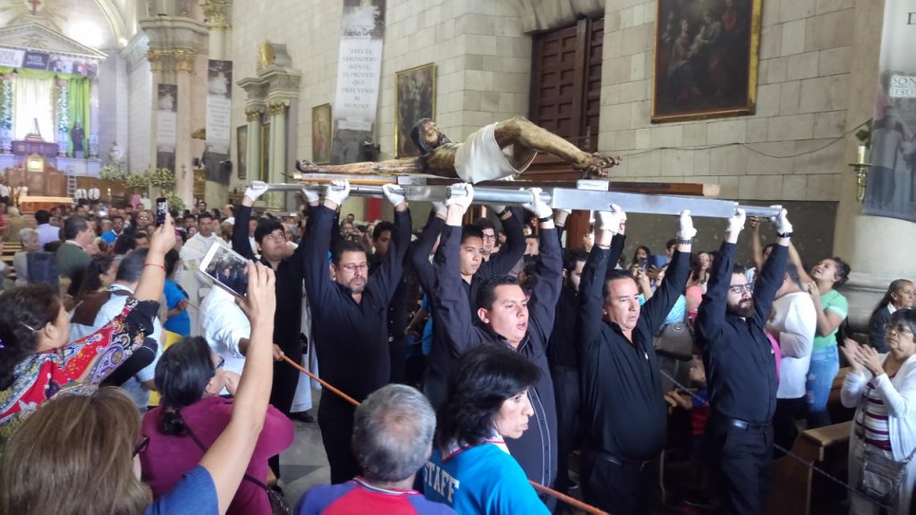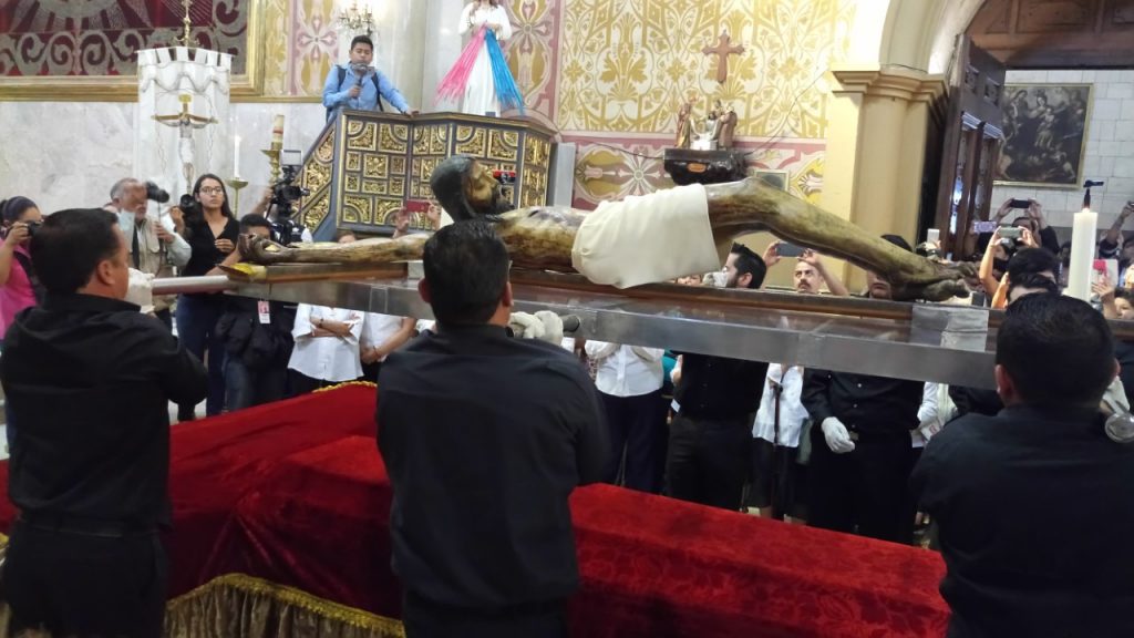Luego de la misa solemne que celebró el Obispo de Saltillo Raúl Vera López junto con otros sacerdotes de la Diócesis, integrantes de la Orden de los Caballeros del Santo Cristo llevaron a cabo el ritual de descenso del crucifijo que, en medio de aplausos, fue colocado en la litera donde se le trasladó nuevamente a la capilla.