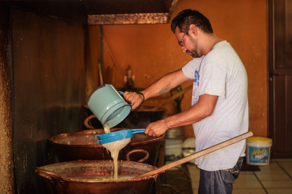 Luego vierten la leche en unos cazos de cobre grandes, mientras menean con un cucharón de madera y cuelan. El calor adentro de la fábrica es tremendo.