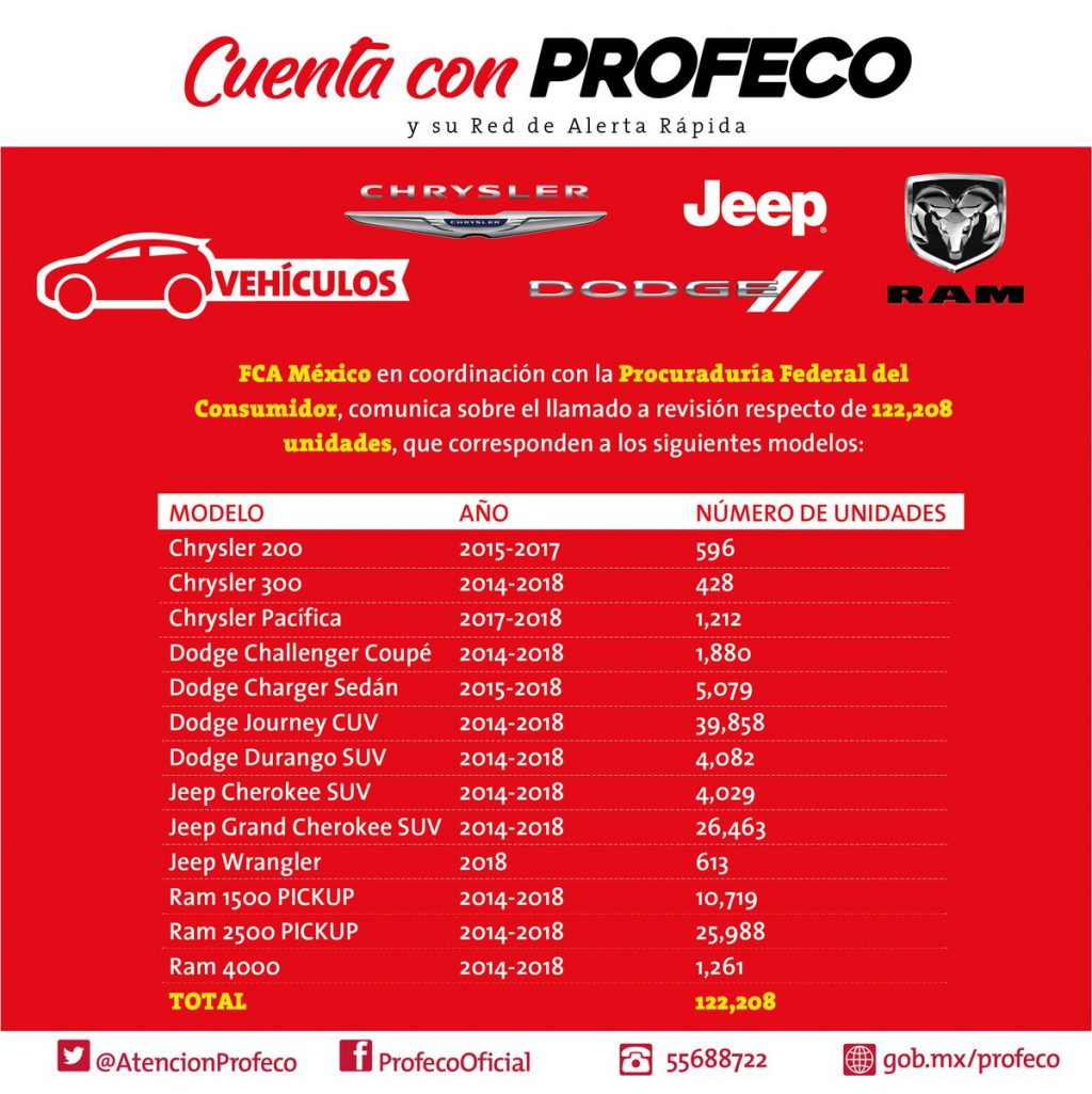 Esta falla también la presentan los modelos Dodge Challenger Coupé de 2014 a 2018; Charger Sedán 2015 a 2018; Journey CUV de 2014 a 2018; Durango SUV 2014 a 2018; Jeep Cherokee SUV 2014 a 2018; Grand Cherokee SUV 2014-2018; Wrangler 2018; Ram 1500 PICKUP 2014-2018; Ram 2500 PICKUP 2014-2018, y Ram 4000 2014-2018.