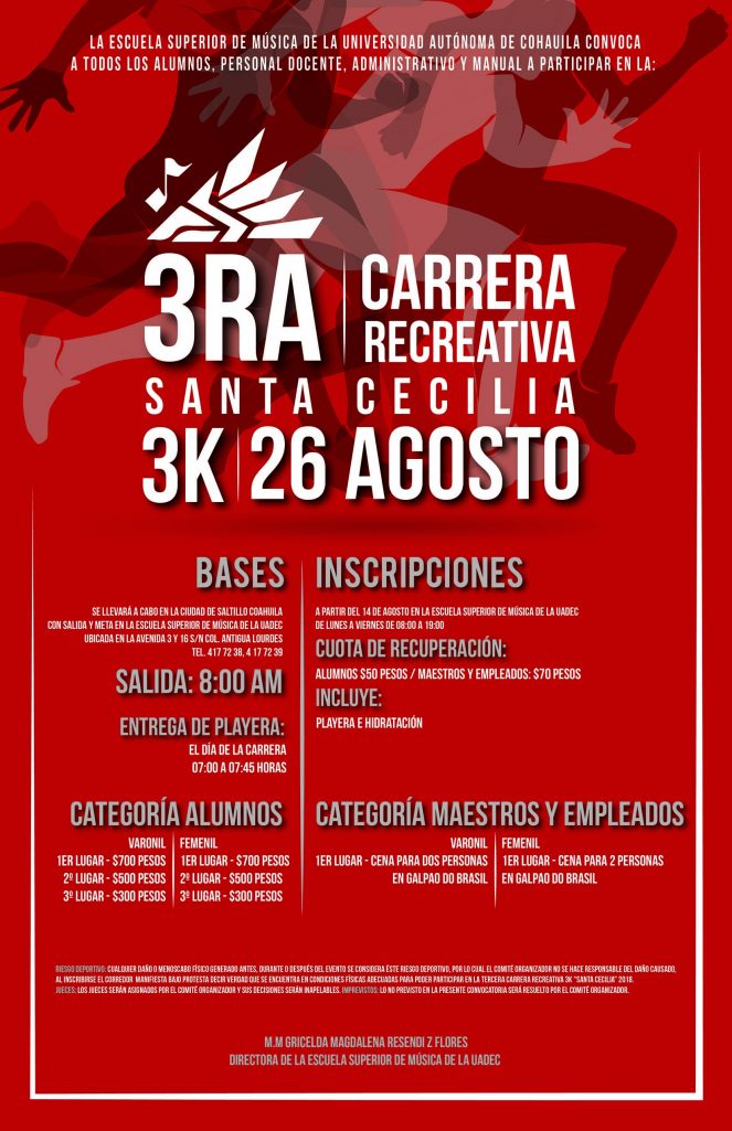 Como parte de las actividades de la Octava Semana de la Tutoría de la Escuela Superior de Música de la Universidad Autónoma de Coahuila, se convoca a estudiantes y docentes del plantel a participar en la Carrera Recreativa “Santa Cecilia” 3k.