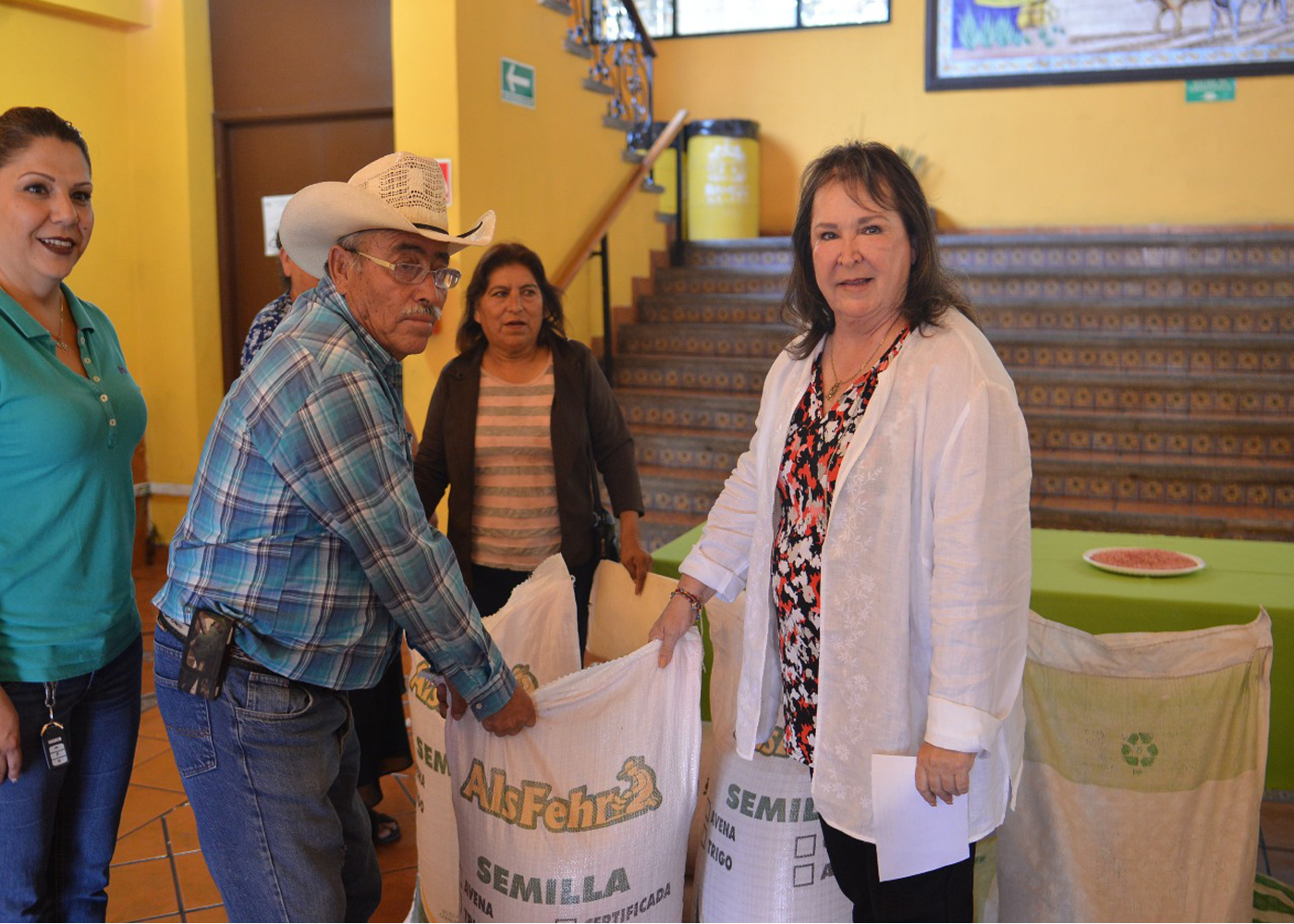 Tita Flores hizo la entrega simbólica de casi novecientos bultos de semilla de avena y doscientos bultos de zacate los cuales estarán a disposición para que los más de trescientos cincuenta productores registrados en el municipio puedan trabajarlas en el campo.