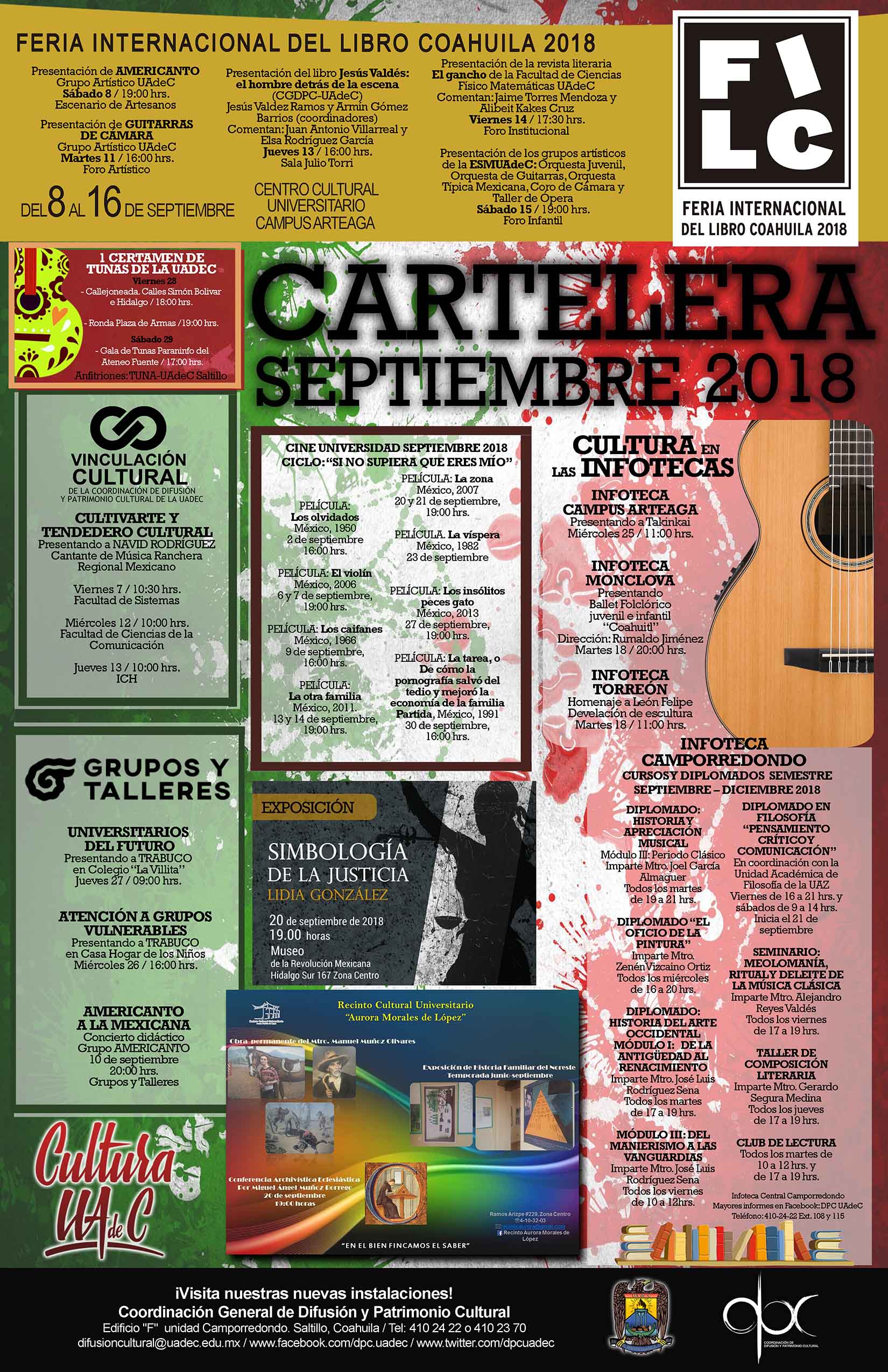 Durante el mes de septiembre a distintas opciones culturales te invita la Universidad Autónoma de Coahuila, que a través de la Coordinación de Difusión y Patrimonio Cultural ofrece en los diversos recintos y espacios universitarios.