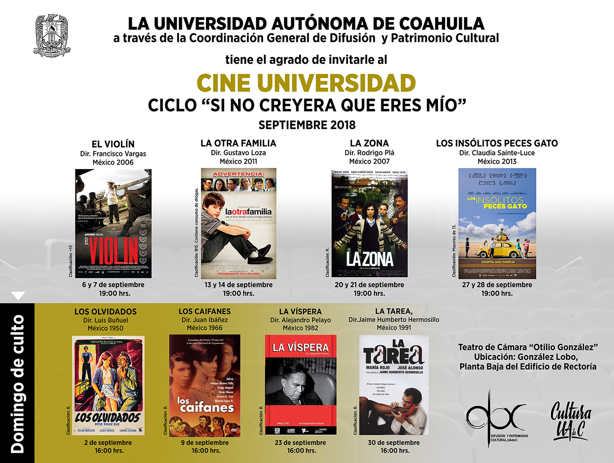 Cine Universidad presenta el ciclo “Si no supiera que eres mío”, en las instalaciones del Teatro de Cámara “Otilio González”, ubicado en la calle Salvador González Lobo, en la Planta baja del edificio de Rectoría, con la proyección de películas mexicanas como “Los Olvidados” el 2 de septiembre a las 16:00 horas; “El Violín” los días 6 y 7 a las 19:00 horas.