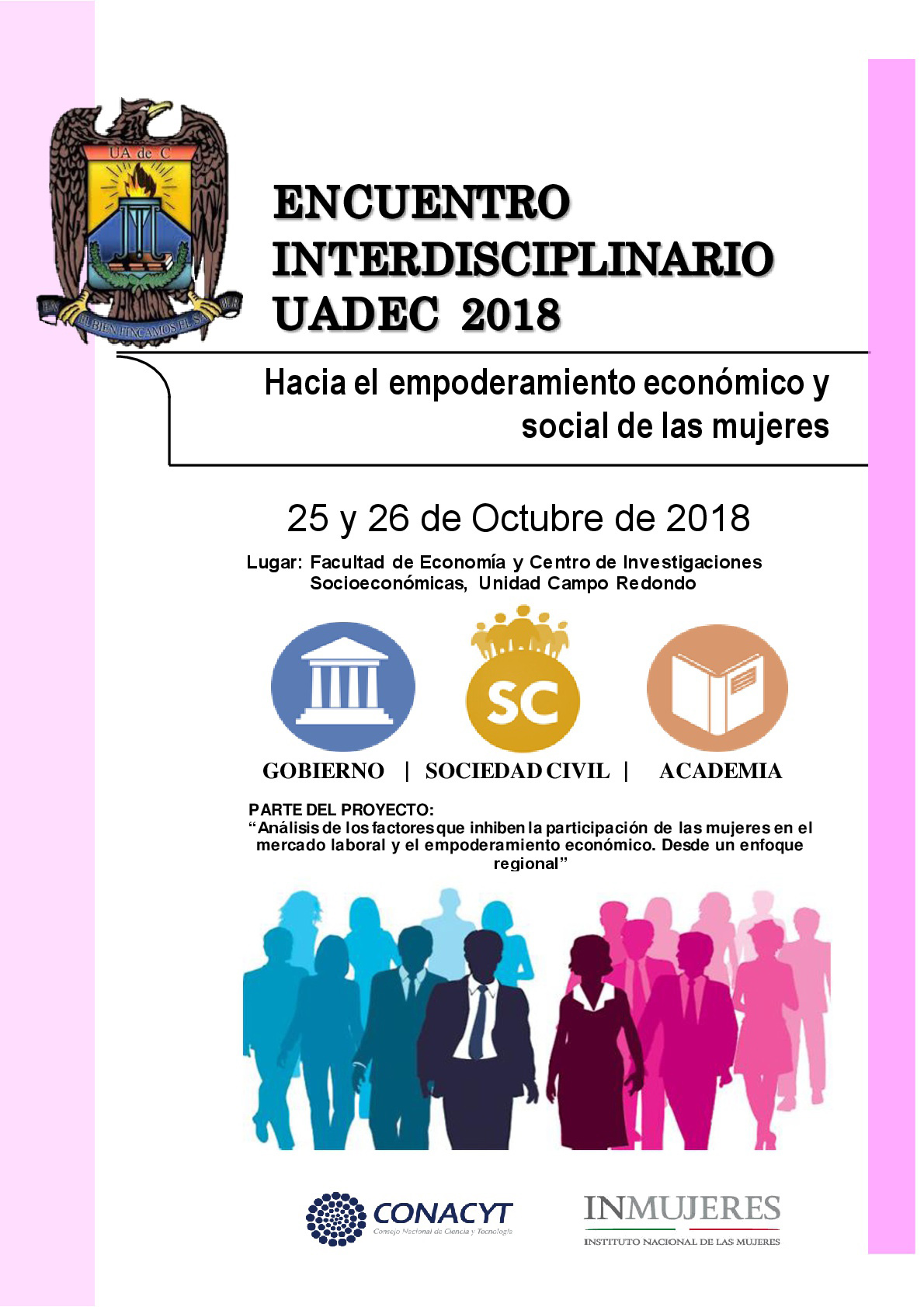“Hacia el Empoderamiento Económico y Social de las Mujeres”, es el Encuentro Interdisciplinario 2018 que invita la Universidad Autónoma de Coahuila, a través de la Facultad de Economía y el Centro de Investigaciones Socioeconómicas (CISE).